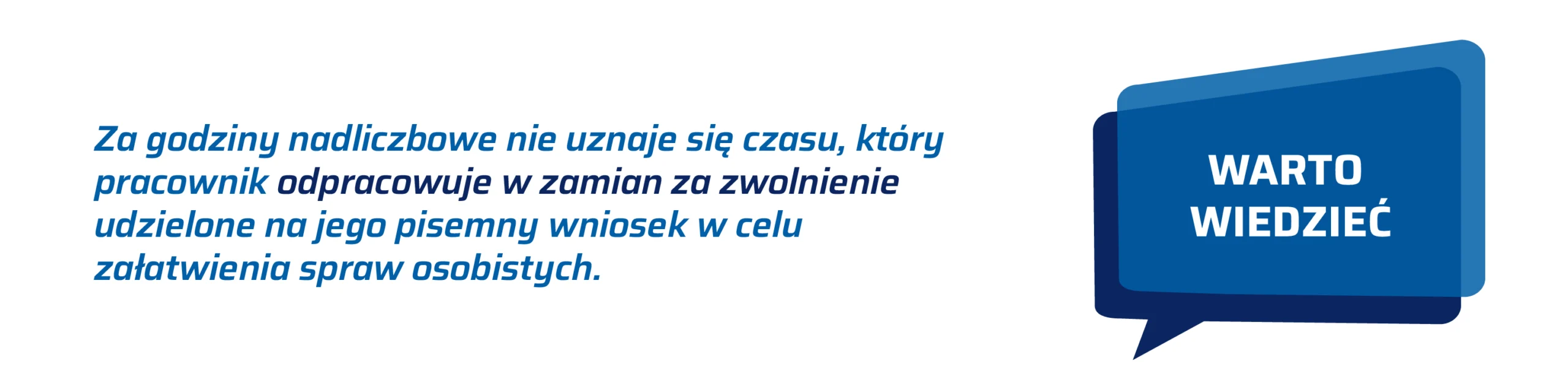 PRZYKŁAD: Pani Gosia jest recepcjonistką w biurze. Szef w czwartek poprosił ją, aby została w pracy o 2 godziny dłużej, a w zamian odebrała czas wolny na drugi dzień. W takim wypadku Pani Gosia w piątek wyjdzie z pracy o 3 godziny wcześniej, niż zwykle.
